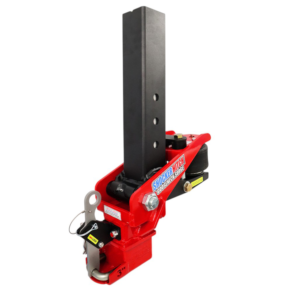 Upgrade your heavy duty gooseneck trailer, with a 40,000 lb gooseneck air hitch & coupler for 3″ gooseneck ball. The 40,000 lb air ride Shocker Gooseneck Surge® air hitch & coupler for 3″ gooseneck hitch ball is the ultimate in smooth gooseneck trailer towing to cushion your towing. This patented, revolutionary air ride shock absorbing cushion hitch is the only air ride hitch to exclusively work in a forward and back motion, which is often times this is the biggest jerk you feel when towing a gooseneck trailer. Design for hot shot gooseneck trailer operators and heavy-duty gooseneck trailer towing. The built in air ride system filters the road shock through the air ride system creating a smoother, safer towing experience for you, your pickup, your trailer & the contents. Plus since you can adjust the air, you can fine tune for when you are fully loaded or towing an empty trailer. Featuring the Patented exclusive 40,000 lbs Shift Lock™ gooseneck air coupler for 3″ gooseneck balls only. It offers 8,000lbs tongue weight. Upgrade your heavy duty gooseneck trailer with the smooth towing solution. Whether you are a occasionally tow or are doing hotshot trucking, this gooseneck hitch adds instant air ride to your hauling. This is the preferred gooseneck air hitch for hotshot haulers. And considered the one best hot shot trucking accessories. Available for Gooseneck trailers with square tube stems. The shock absorbing hitch for a gooseneck trailer is made for smooth and safe towing. Works great on gooseneck style end dumps, flatbed, race haulers, livestock, toy haulers, tilt, horse trailers and more. Completely replaces your factory gooseneck stem & coupler with the Gooseneck Surge Air system & 3″ gooseneck ball shift lock coupler. Installs in minutes. Featuring 3 height adjustment holes & extends your hitch 3″ forward. Made by Shocker Hitch® USA in Jamestown, ND. Patent #’s 11,370,257 B1 & D898,628.