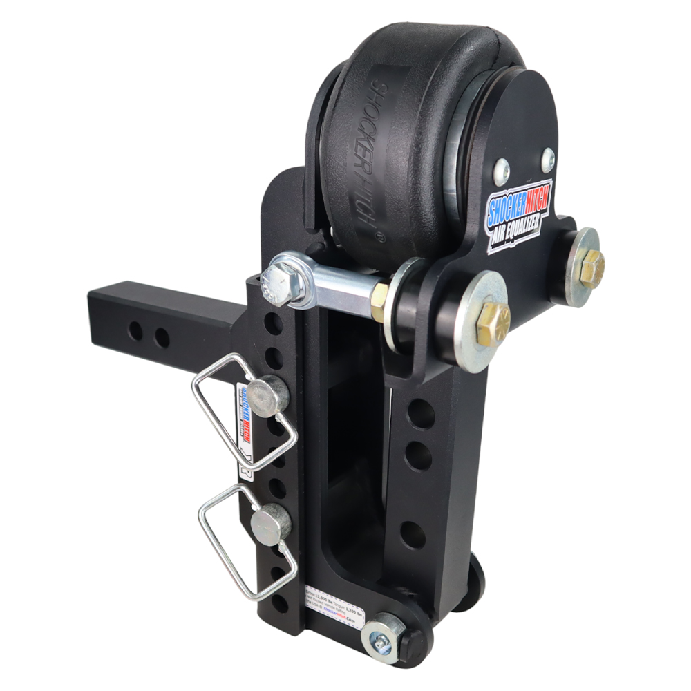 - Shock Dampening Action: Shocker air equalizer hitch effectively absorbs the jerking, tugging and damaging forces experienced with a typical hard connection when towing trailers. There is no reason to beat yourself or your equipment up with a hard connection between the trailer & receiver hitch.