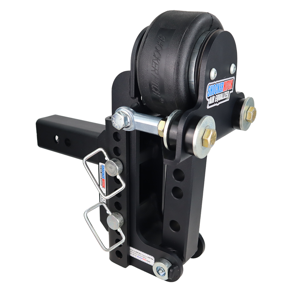 The Shocker Air Equalizer allows you to add instant air ride towing to your pickup & camper with that currently has equalizer or weight-distribution hitch. The Shocker Hitch Air Equalizer for W-D hitches easily bolts to your existing weight distribution head. Get air ride towing in minutes. The air equalizer hitch system for a load leveling or wd hitch, absorbs the road shock and cushions the chucking, tugs, and jerks you feel when towing a camper & pickup with a weight distribution system. Fits most major brands of weight-distribution hitches. This Shocker Air Equalizer has 12,000 lbs towing & 1,200 lbs tongue weight rating capacities and offers 7 or 9″ inches of adjustment up or down (5″ rise to 2″ of drop or choose 5″ rise to 4″ of drop). Air Equalizer kit comes with Air Equalizer, XR hitch base frame for a 2″, 2-1/2″ or 3″ receiver hitch. The built-in air ride system, along with the 4 bump cushions, direct the rock shock through the air ride system, still allowing your weight-distribution hitch to work as intended, giving you a smoother and safer ride for you, your pickup, camper, and its contents. Plus the additional advantage of the Shocker Hitch for your weight distribution hitch is your ability to adjust air pressure up or down when your towing different weights for the best ride and load control. Featuring a premium textured black powder-coat finish on the air equalizer & on the XR hitch. Fits Pickup Trucks Only: This is designed for pulling with a Pickup Truck – it will not work with SUVs/CUVs with coil-over springs in the rear.