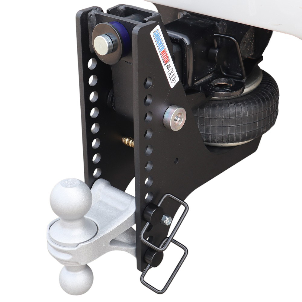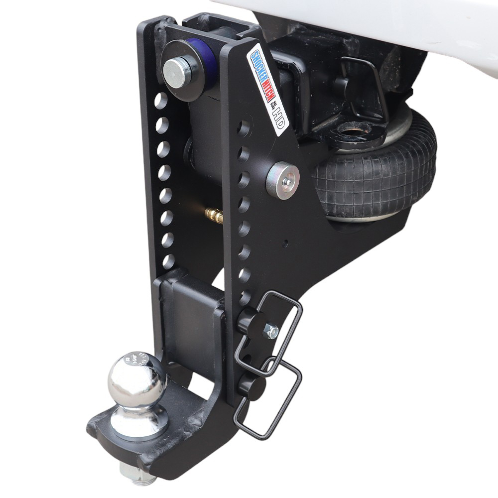 - Complete Kit Includes: Shocker HD Max Black Super Drop air receiver hitch with built-in 20K air ride system & dual bump cushions, ball mount you chosen and two d-handle mount attachment pins with clips.