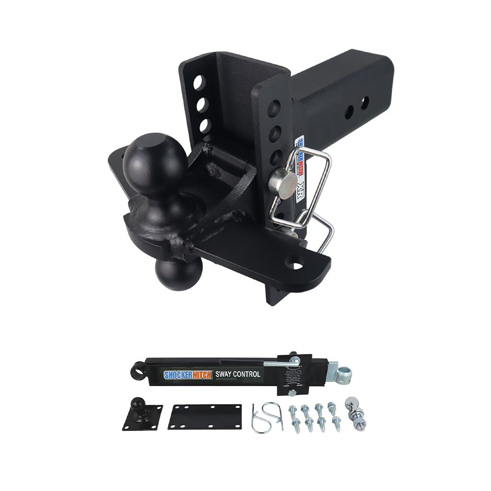 Reduce trailer sway and tow with ease of mind when using the Shocker XR Series Hitch with Sway Control Towing Starter kit. Designed specifically to reduce trailer sway when towing this kit includes air ride hitch & black combo ball mount with welded sway bar mounting tabs along with 1 or 2 sway arm bars. The Shocker XR hitch with black combo ball mount kit with welded tabs for sway control arm bars includes the friction sway arm & ball kit along with everything else you need. Featuring a combo multi-ball mount with both a 2″ hitch ball and a 2-5/16″ hitch ball. Up to 20,000 lbs tow rating capacity and 2,000 lbs tongue weight depending on shank size. It has 8″ to 10″ of height adjustment range from 4″ of rise to 4″ or 5-1/2″ rise to 5-1/2″ of drop depending on hitch selected. Combo ball mount with a premium powder-coated black finish along with sway bar tabs for the mini ball on each side. Shocker XR adjustable hitch ball mount provides versatility and a way simpler towing experience than a standard solid ball mount. The XR ball mount has built-in adjustability maximum versatility with 8 adjustment holes for your towing needs for pulling campers to enclosed trailers.